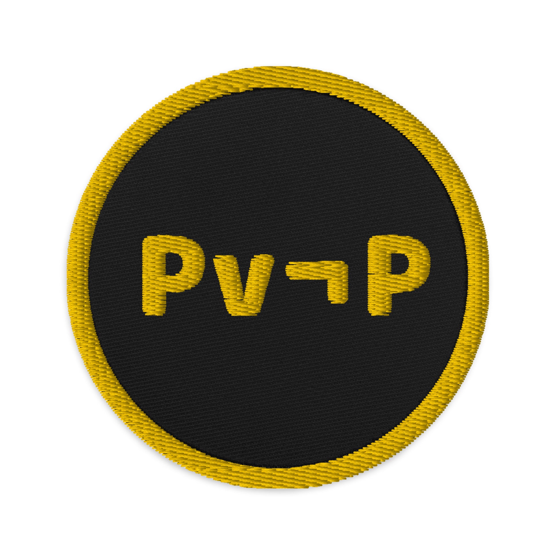 An embroidered patch with a durable twill weave featuring the formal symbolism for the law of excluded middle in propositional logic.