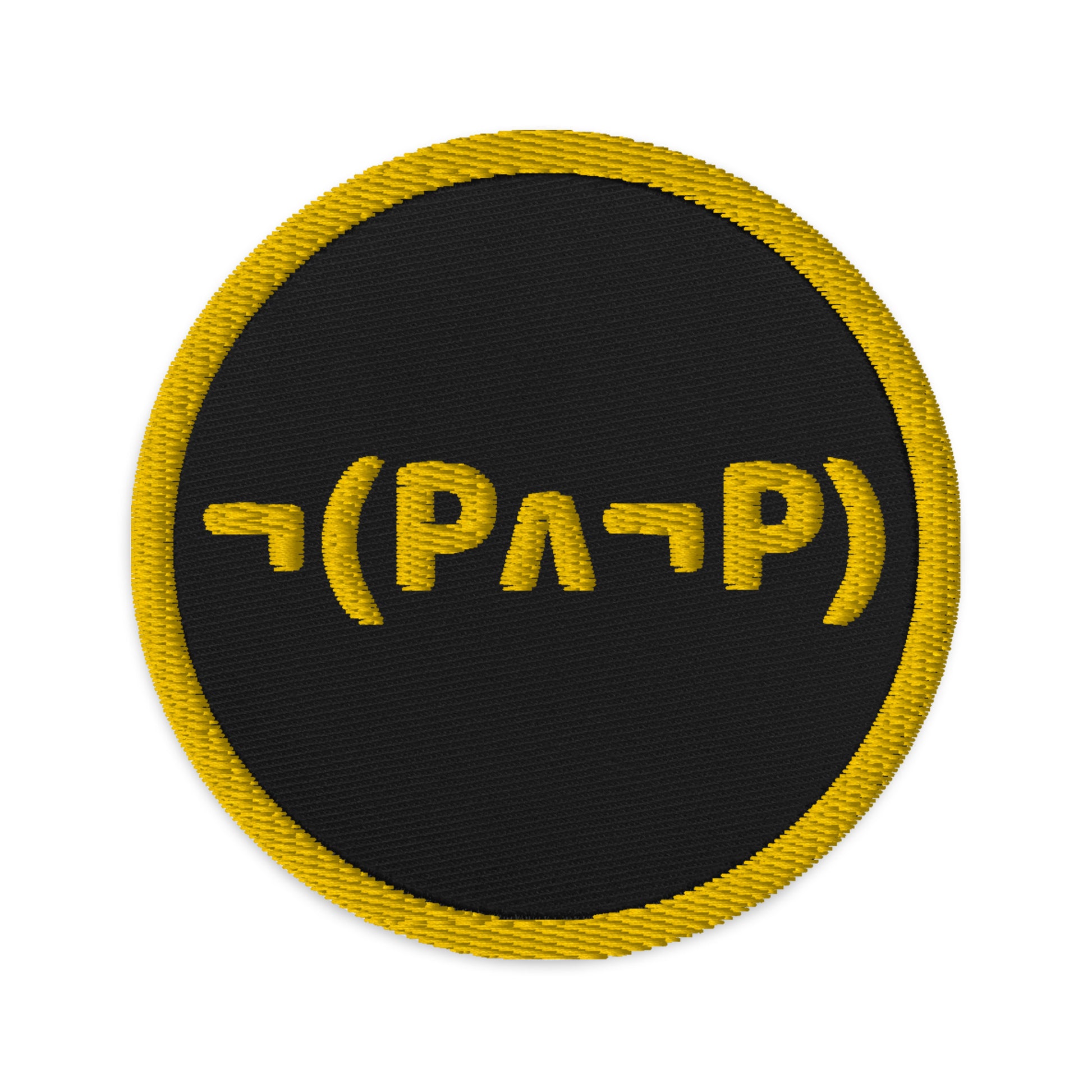 An embroidered patch made with a durable twill weave featuring the formal symbolism for the law of non-contradiction in propositional logic.