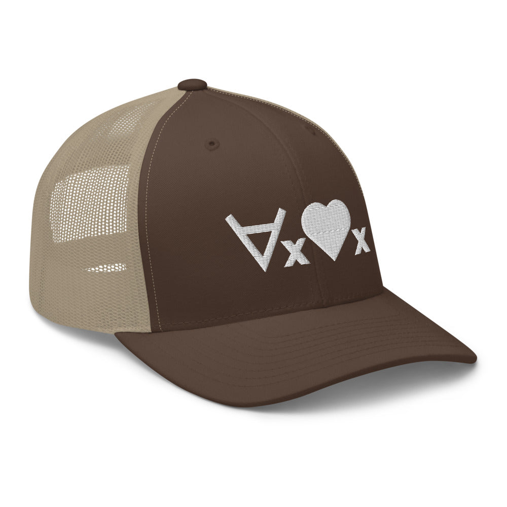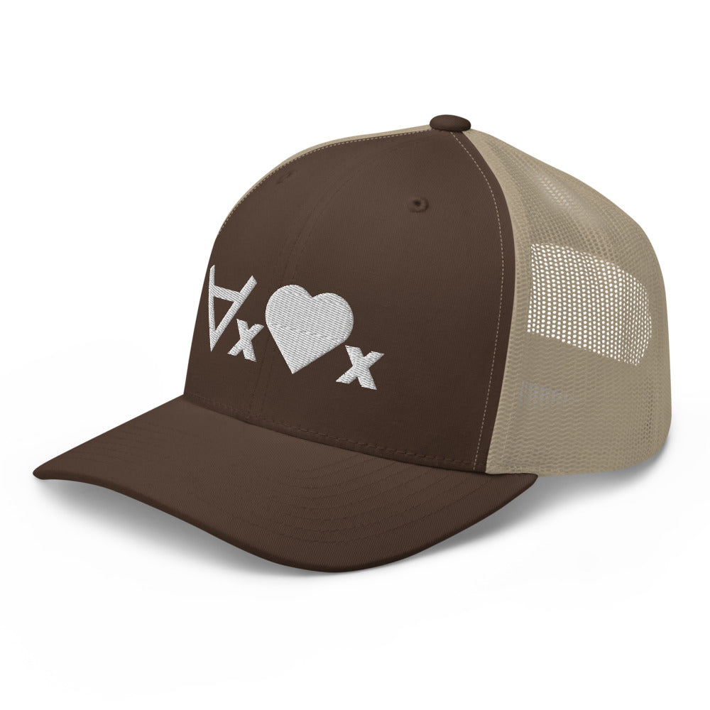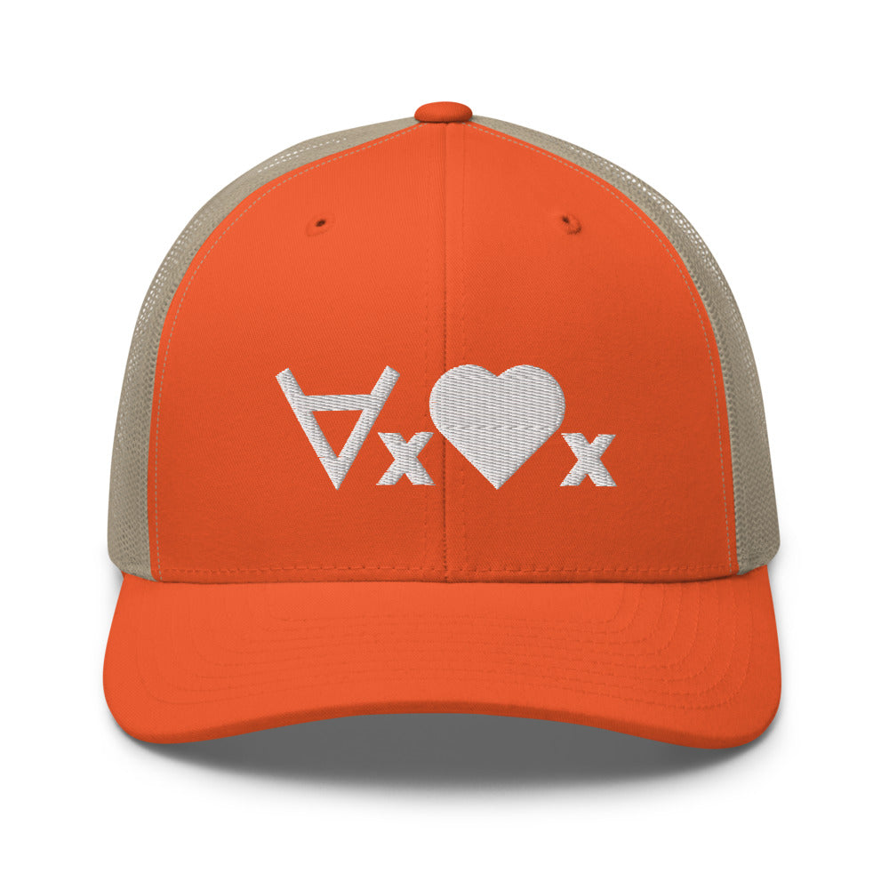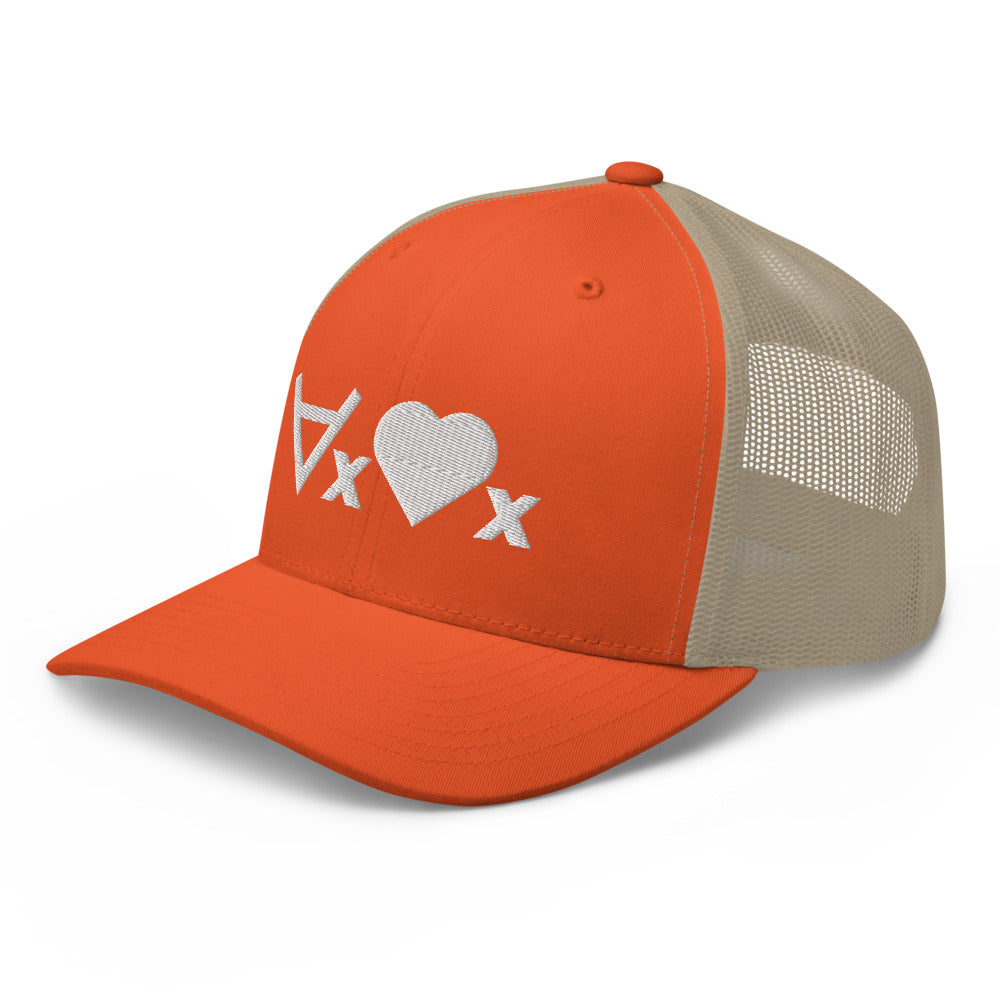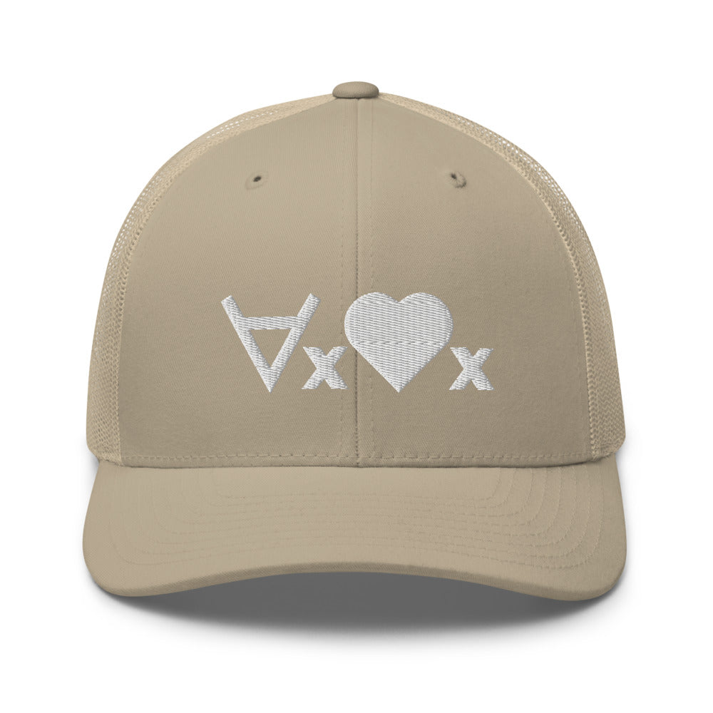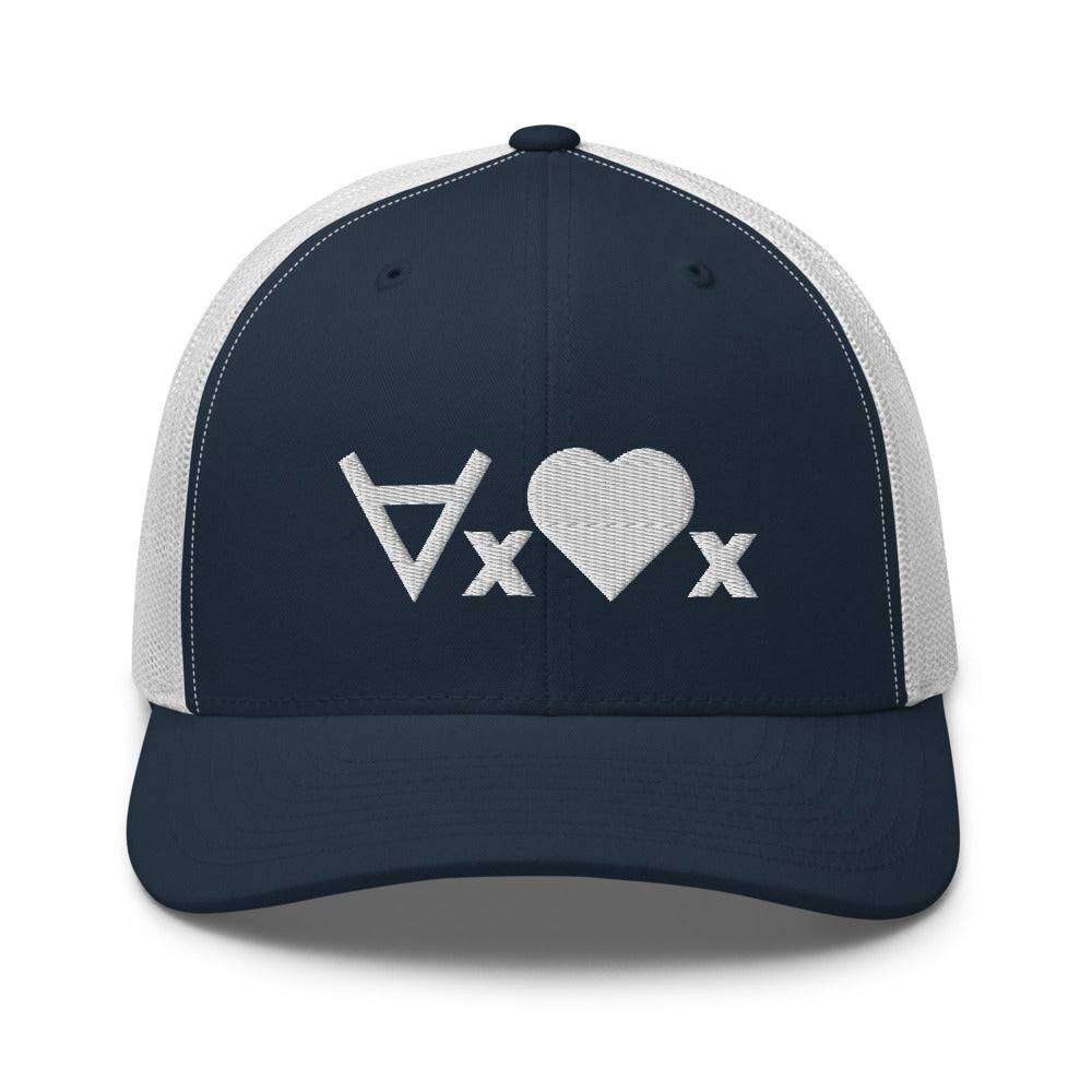 This cap plays on symbolic logic, using the universal quantifier symbol and with a heart as a predicate symbol, saying "for every x, x is loved", or, "love everyone". The hat is a classic trucker cap with six panels including a mesh snapback, with the ∀x❤x formula embroidered on the front.