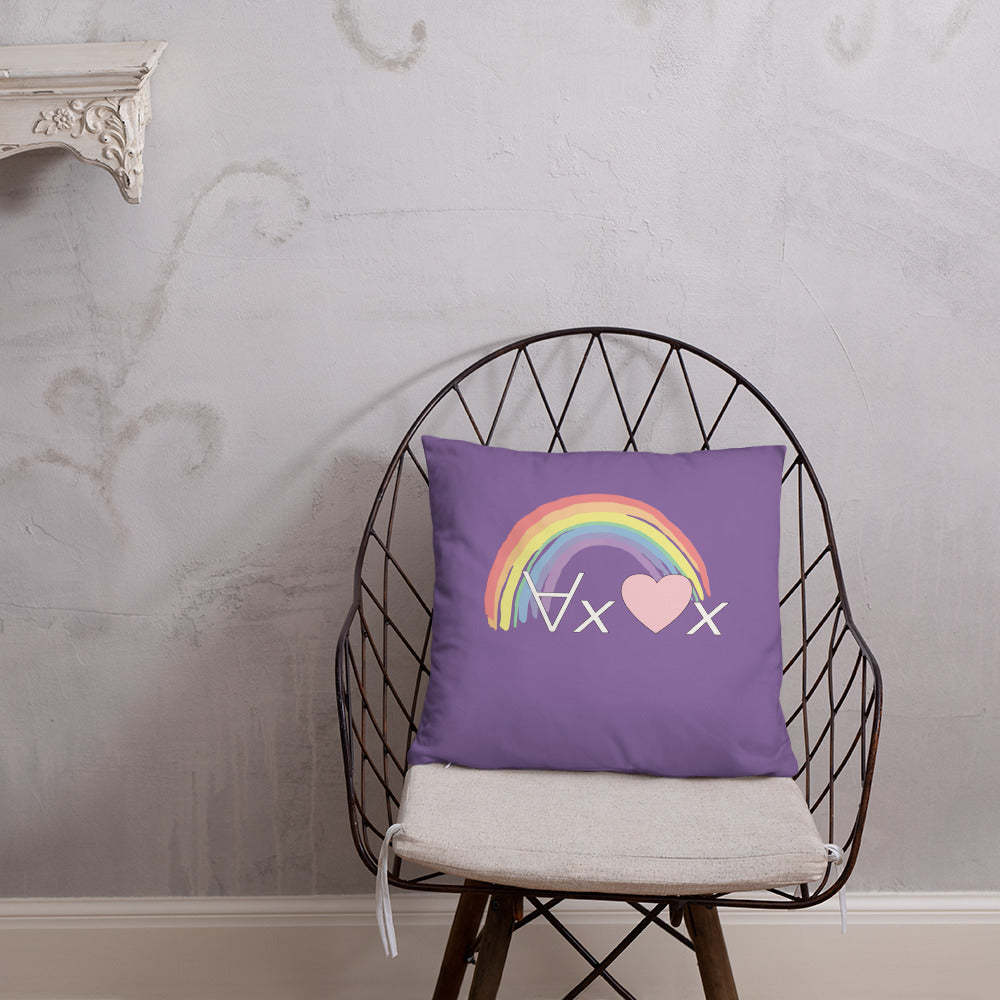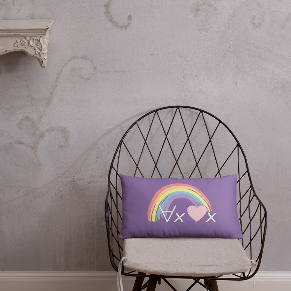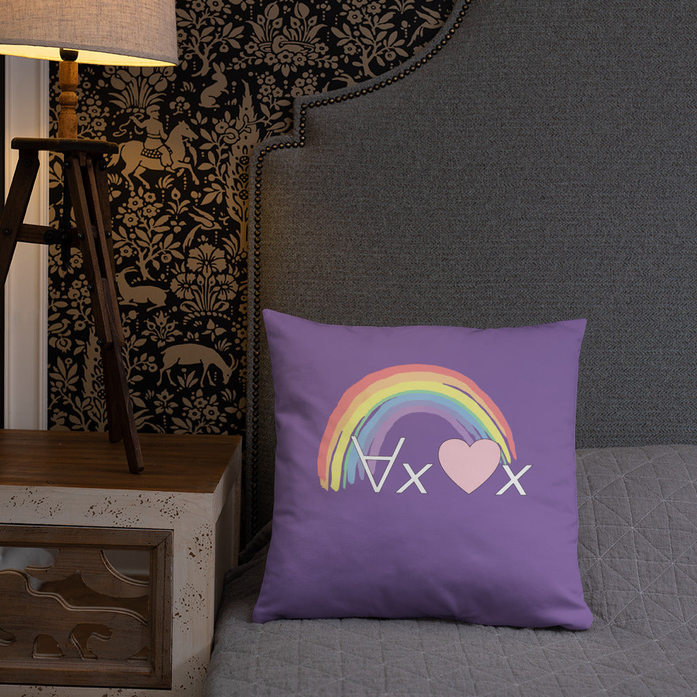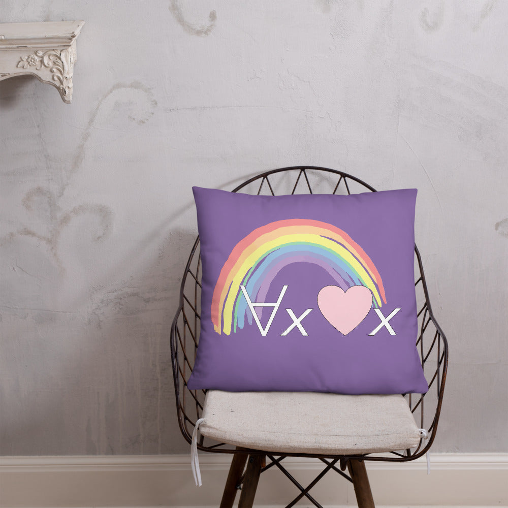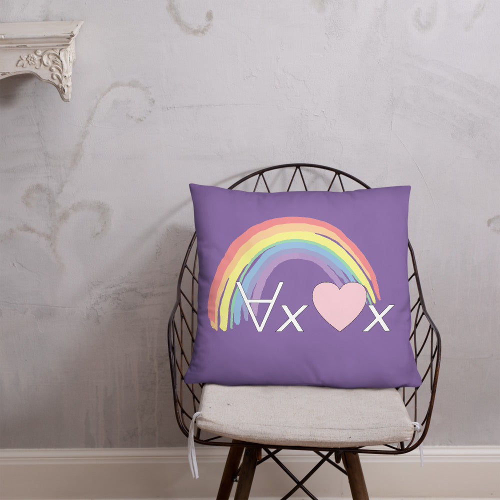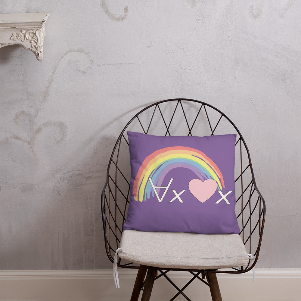 A fanciful bit of symbolic first-order logic on a purple throw pillow with a formula meant to be read as "love Everyone" and a rainbow design.