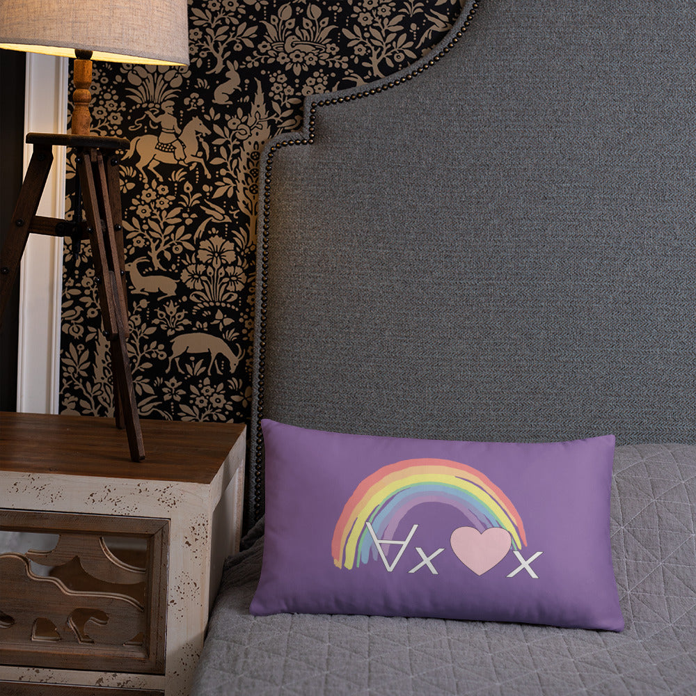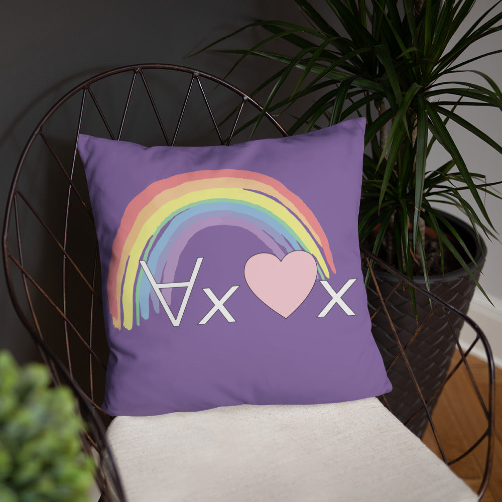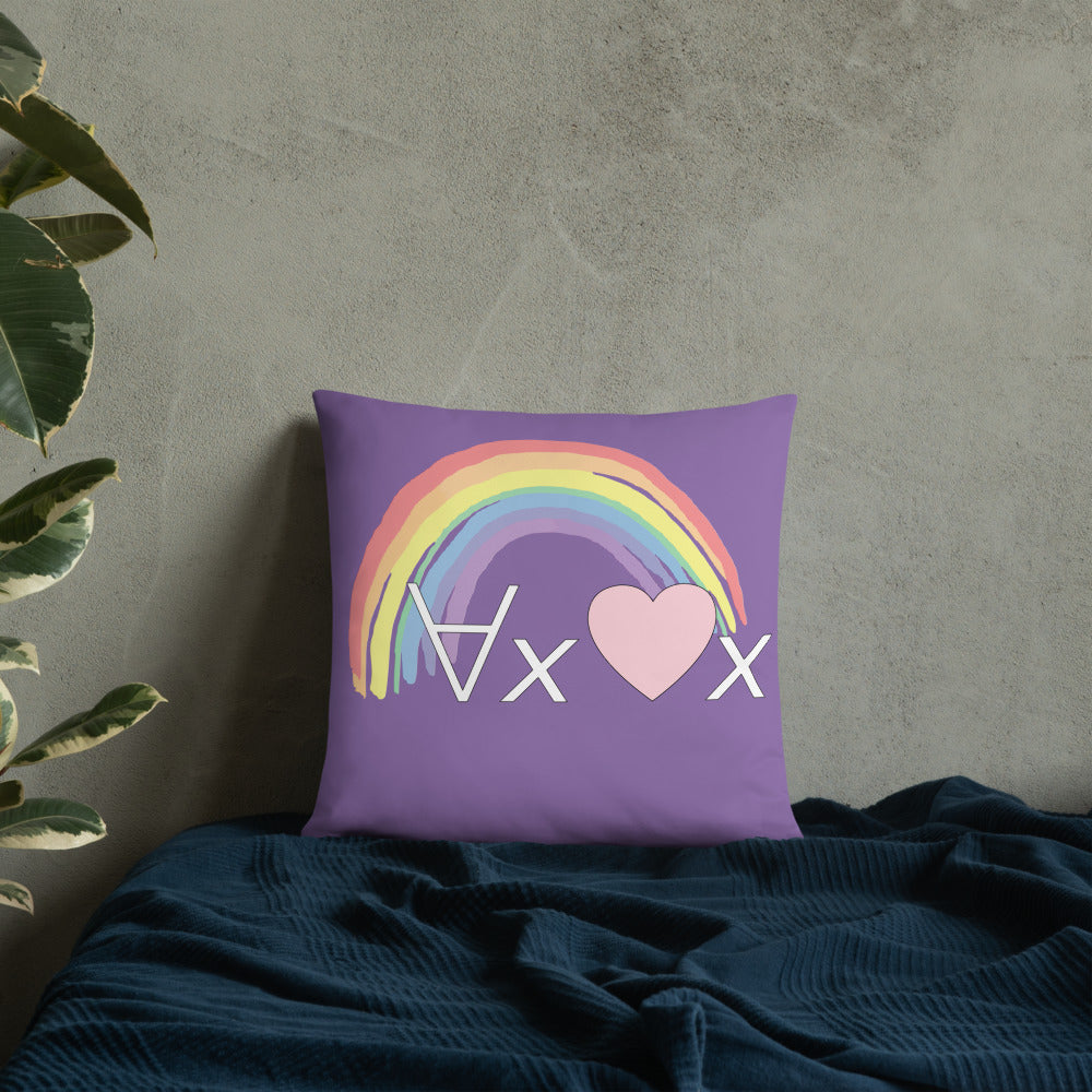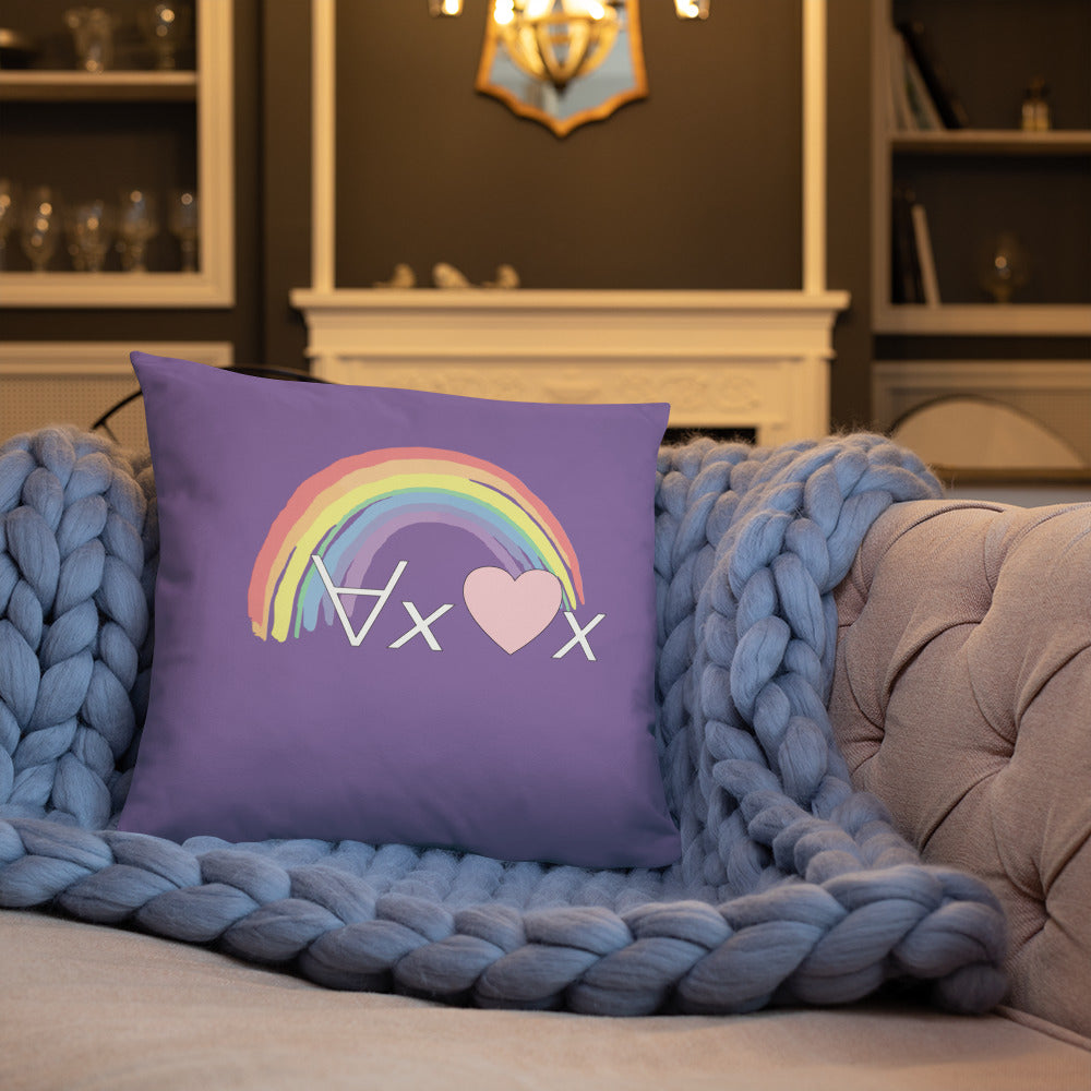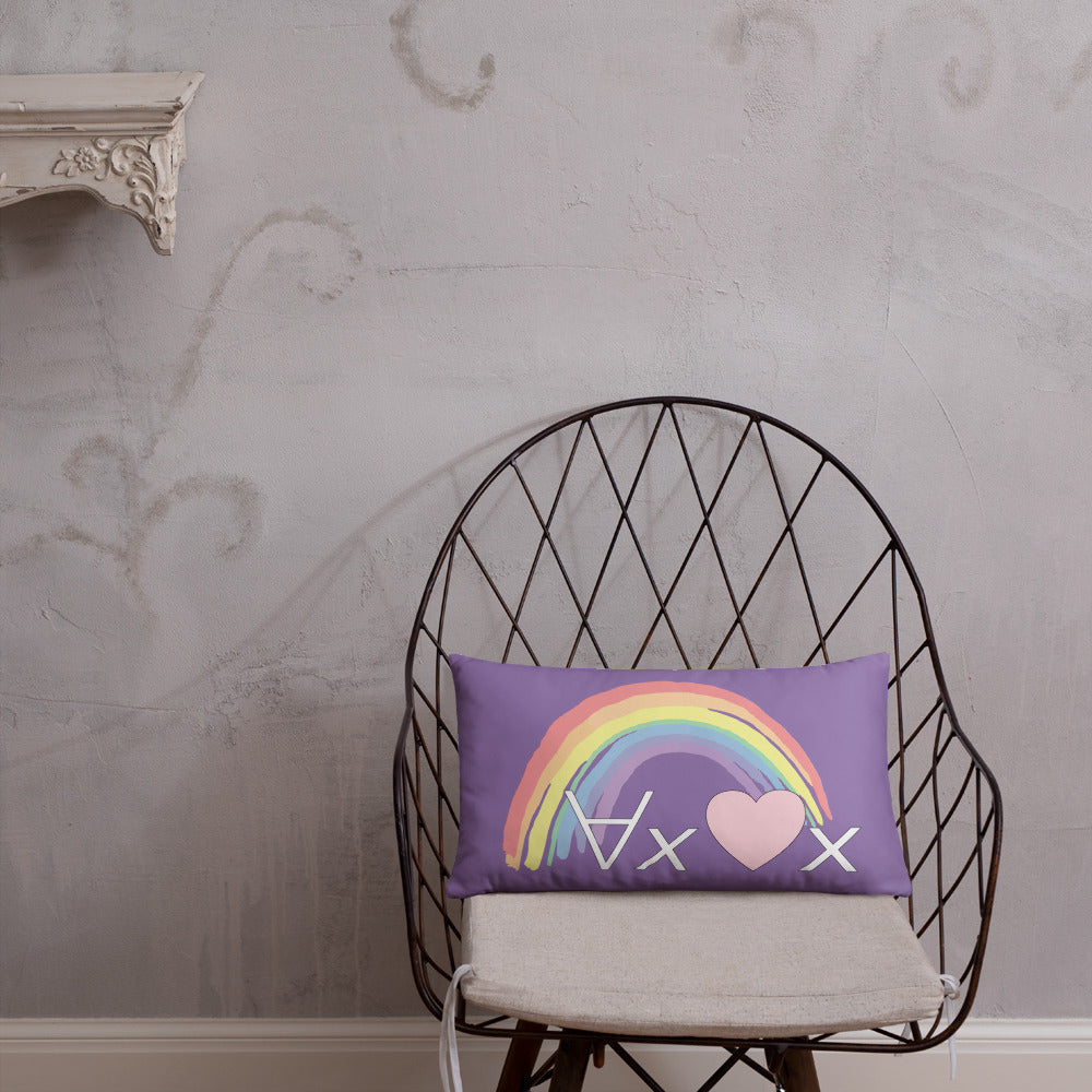 A fanciful bit of symbolic first-order logic on a purple throw pillow with a formula meant to be read as "love Everyone" and a rainbow design.