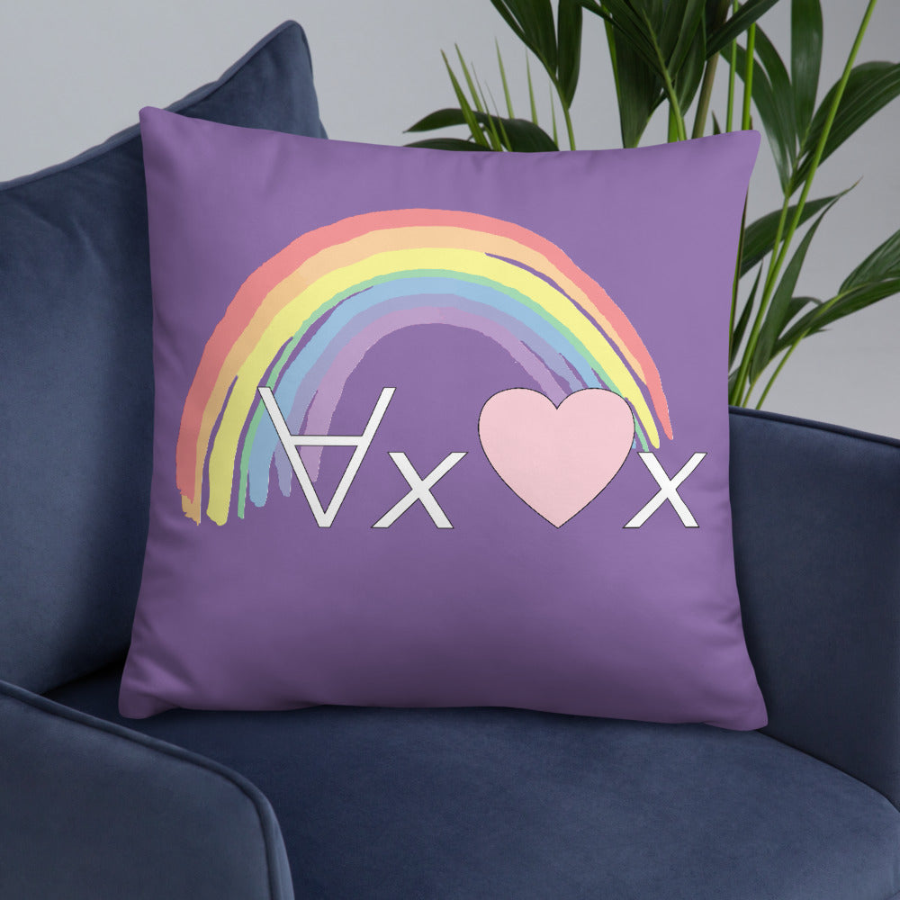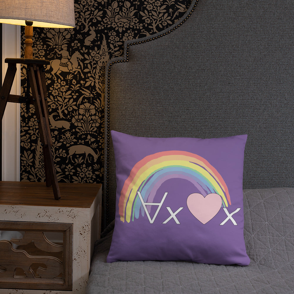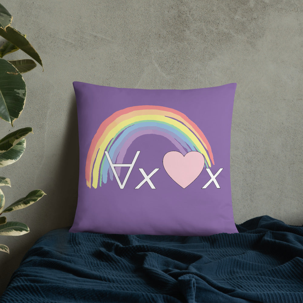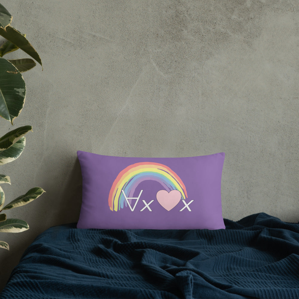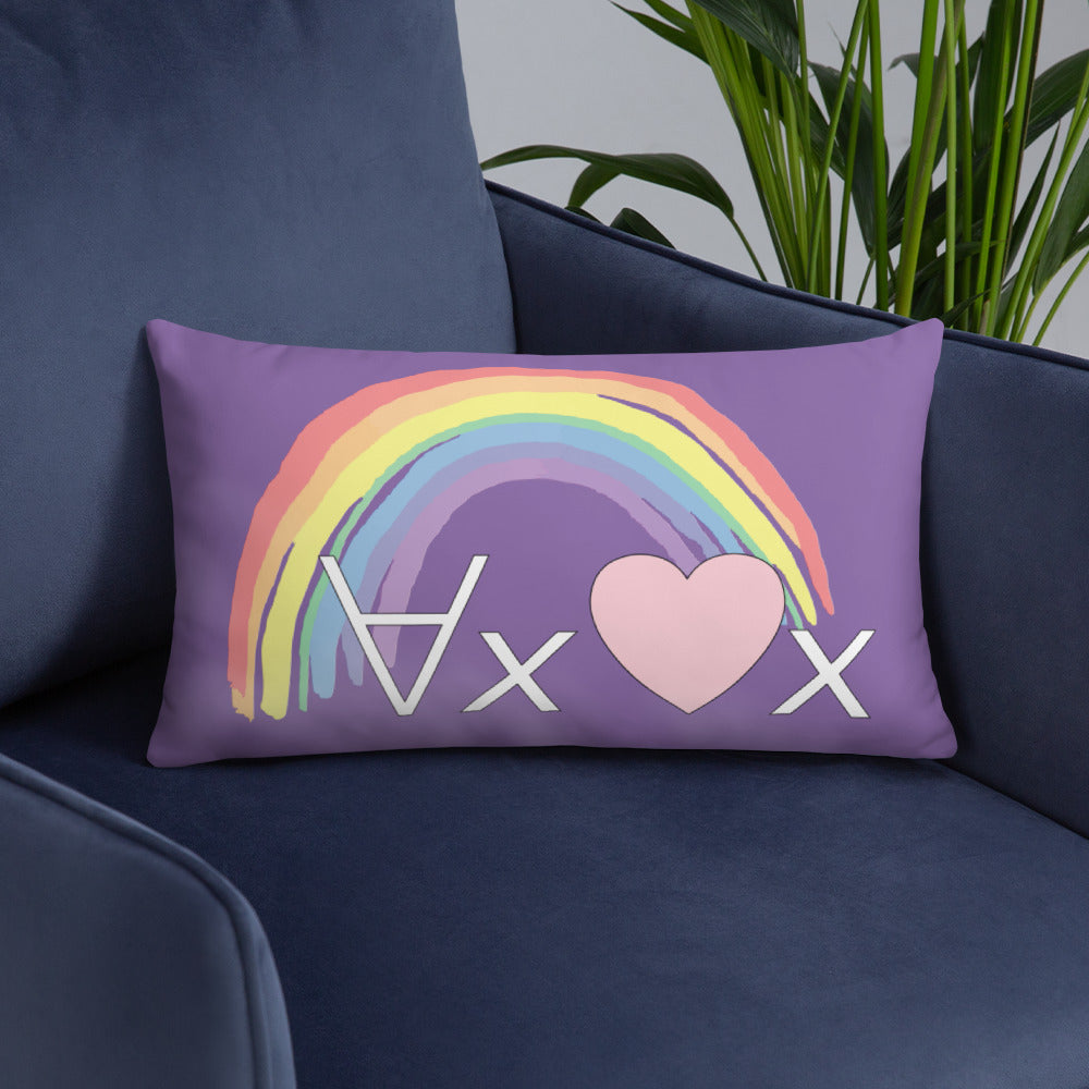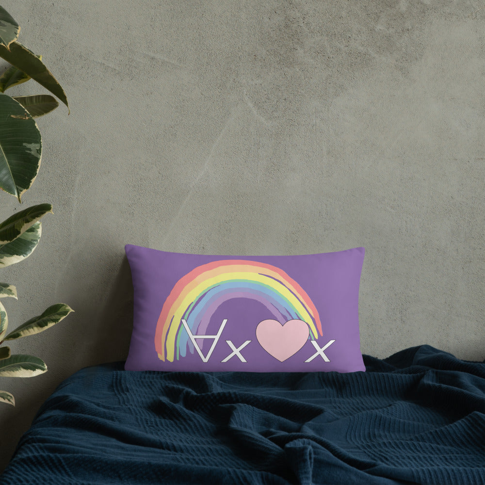 A fanciful bit of symbolic first-order logic on a purple throw pillow with a formula meant to be read as "love Everyone" and a rainbow design.