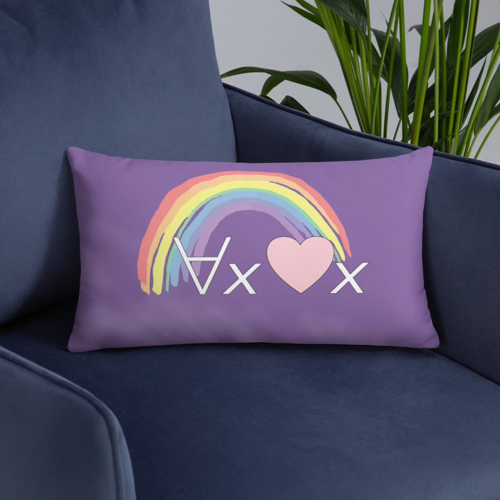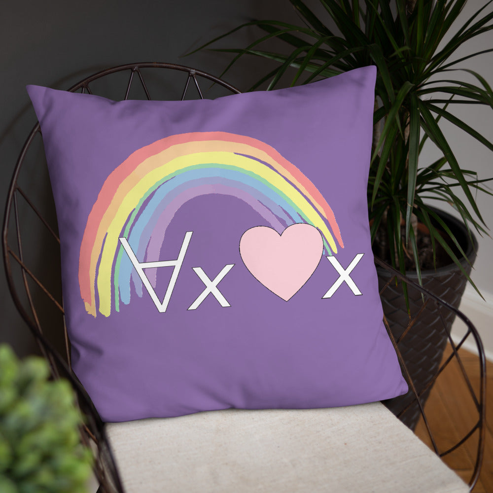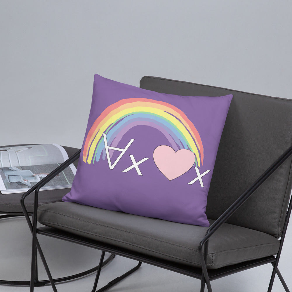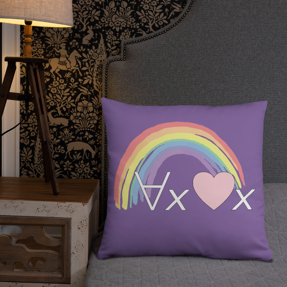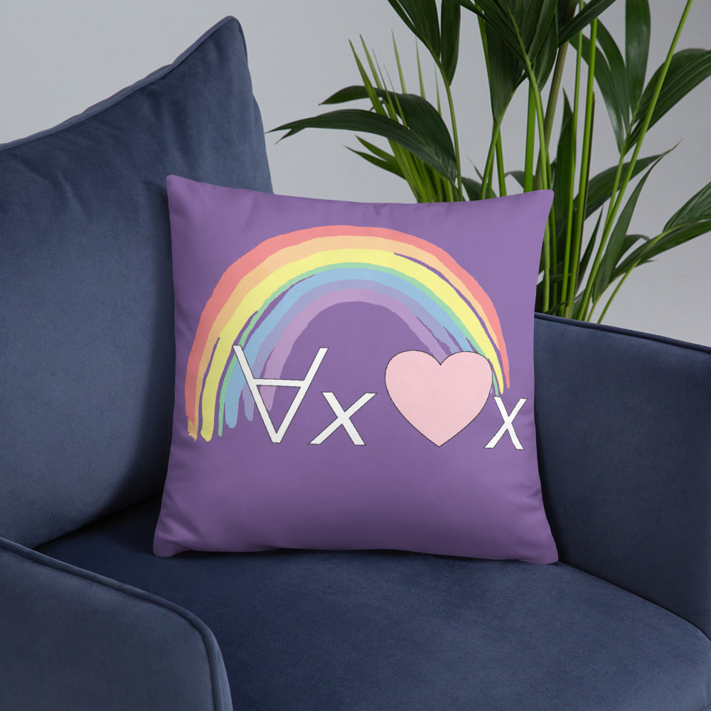 A fanciful bit of symbolic first-order logic on a purple throw pillow with a formula meant to be read as "love Everyone" and a rainbow design.
