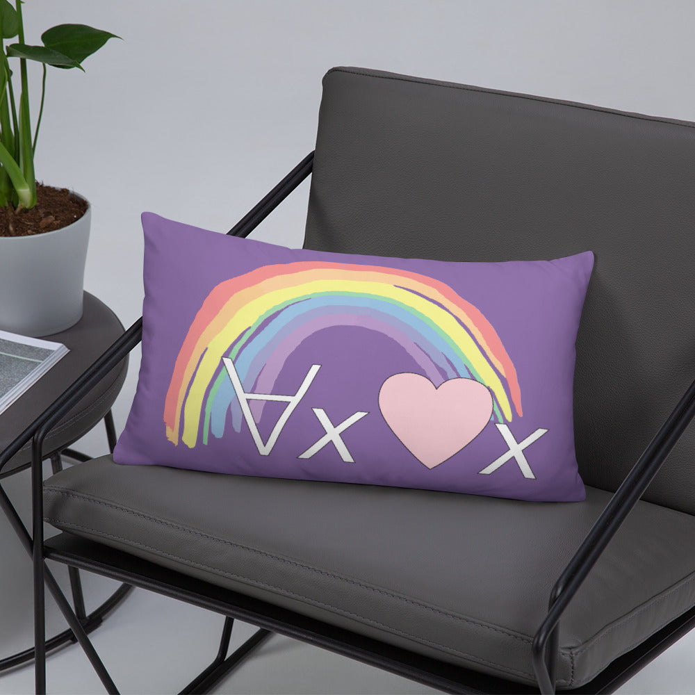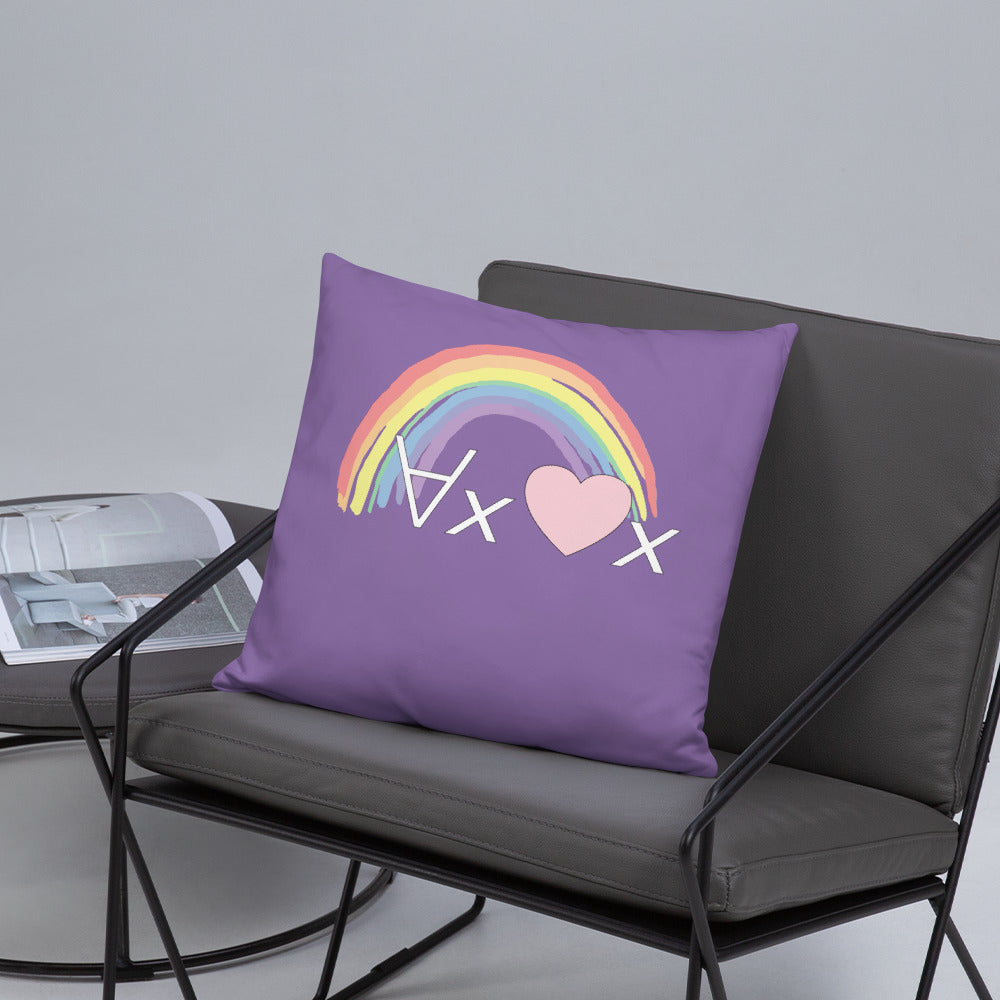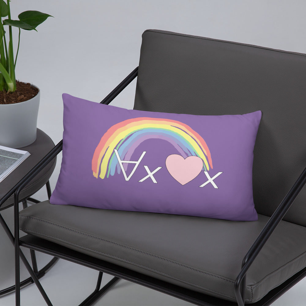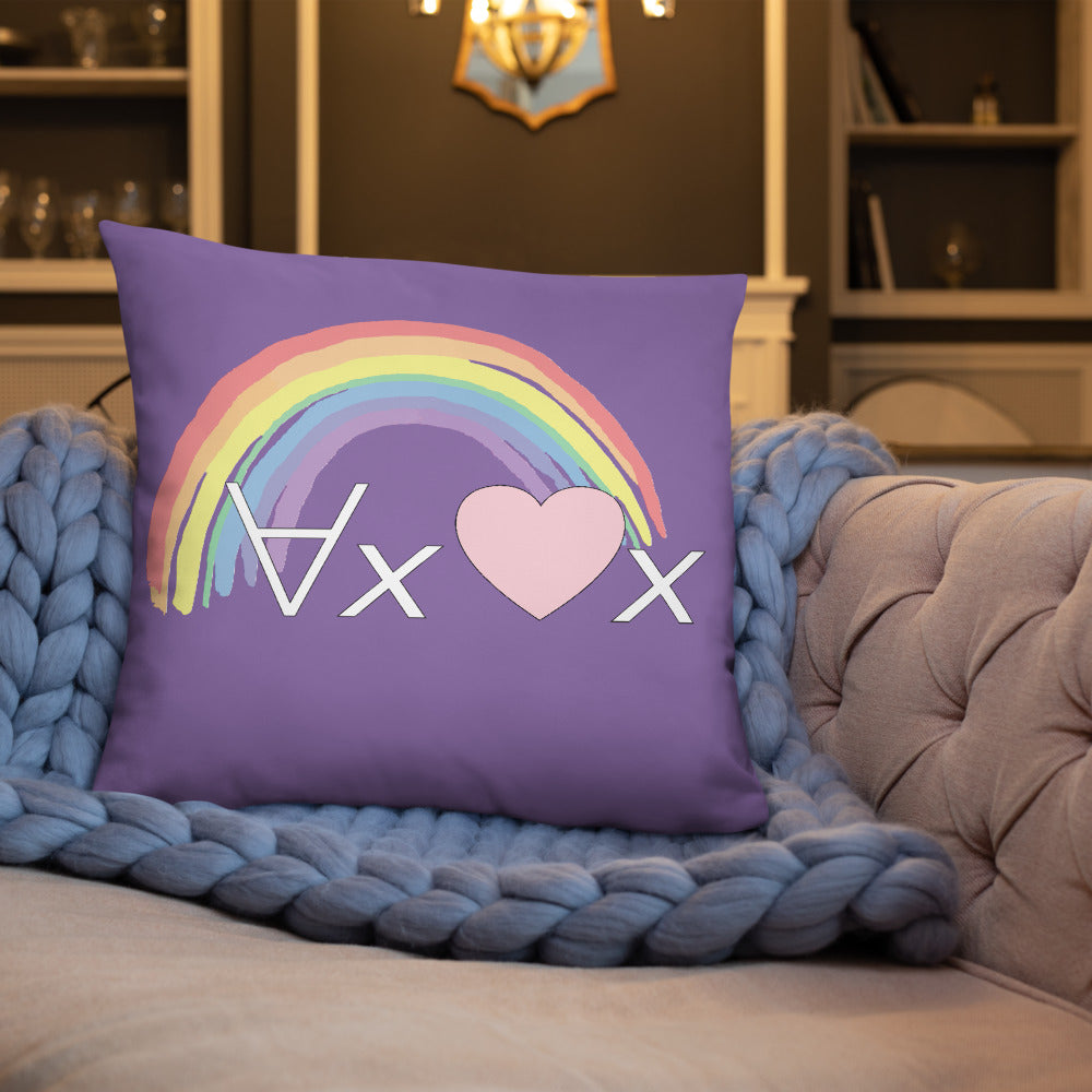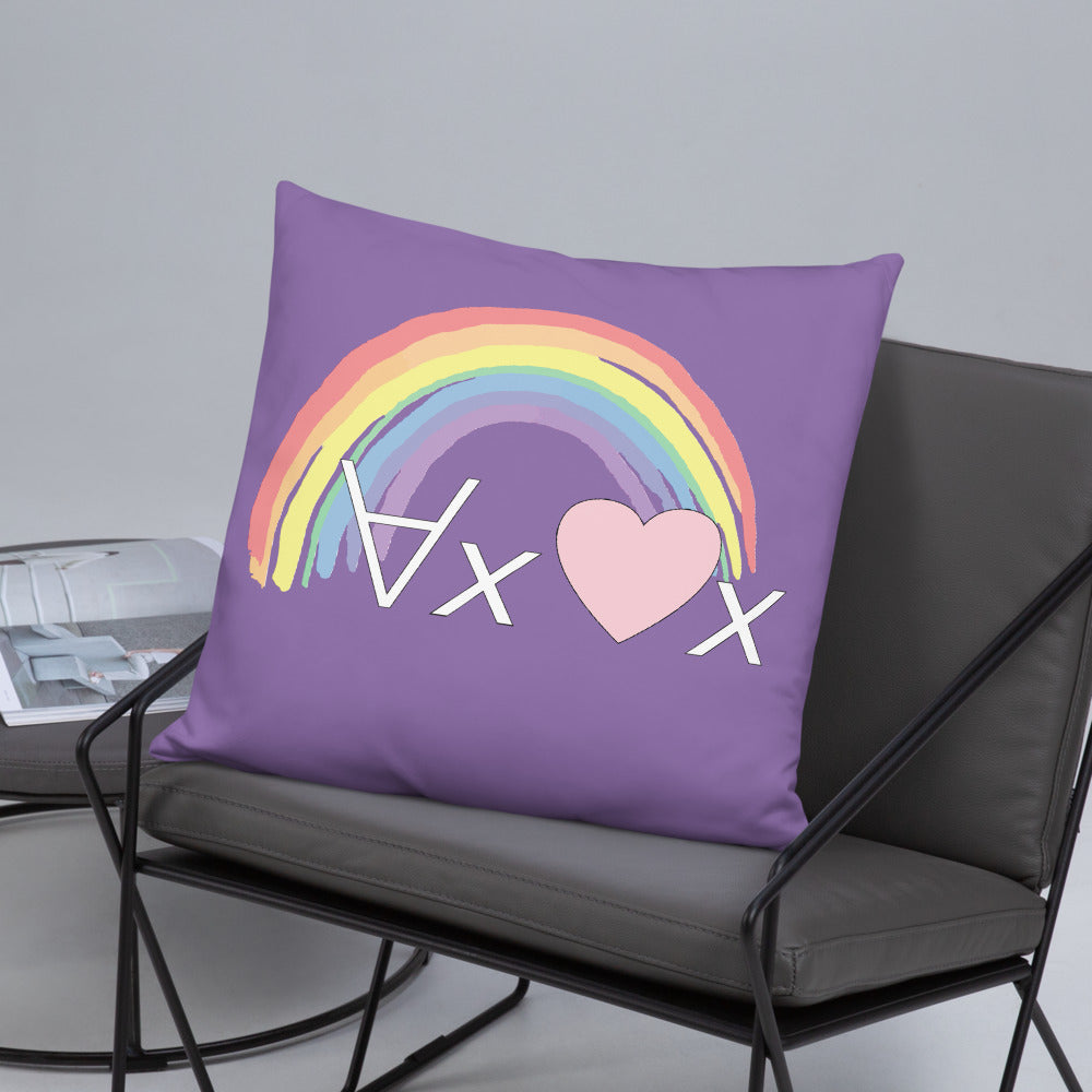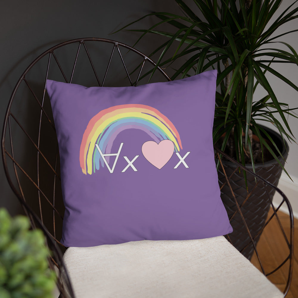 A fanciful bit of symbolic first-order logic on a purple throw pillow with a formula meant to be read as "love Everyone" and a rainbow design.
