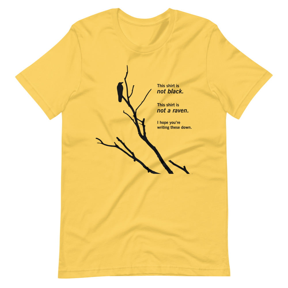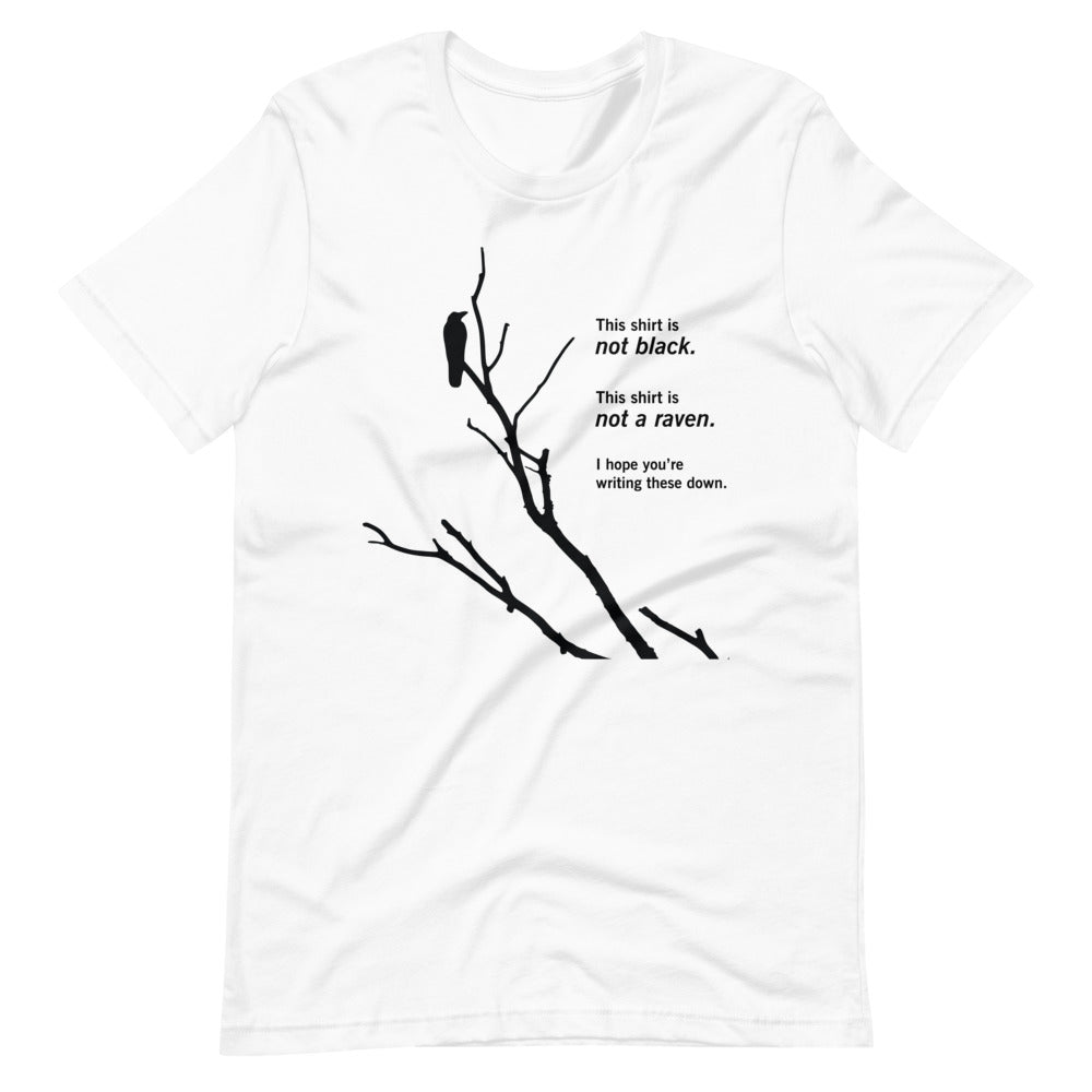 The raven paradox notes that, at least formally, if seeing a black raven is evidence for the claim "all ravens are black", then so is any observation of anything that is neither black nor a raven. This is meant to highlight a problem in philosophy of science. Since this T-shirt is a non-black non-raven, we say it can be added to your growing list of things that support the claim "all ravens are black".