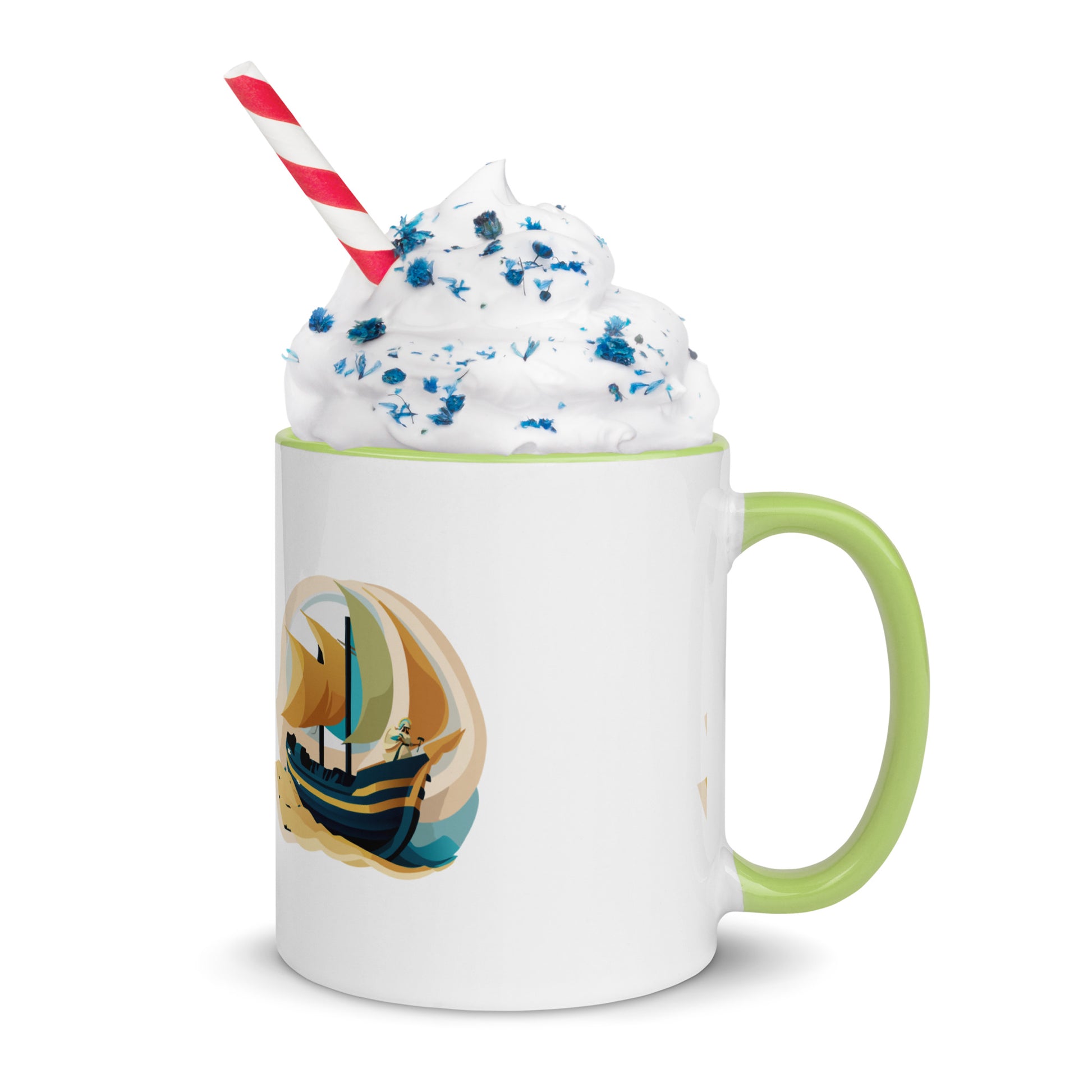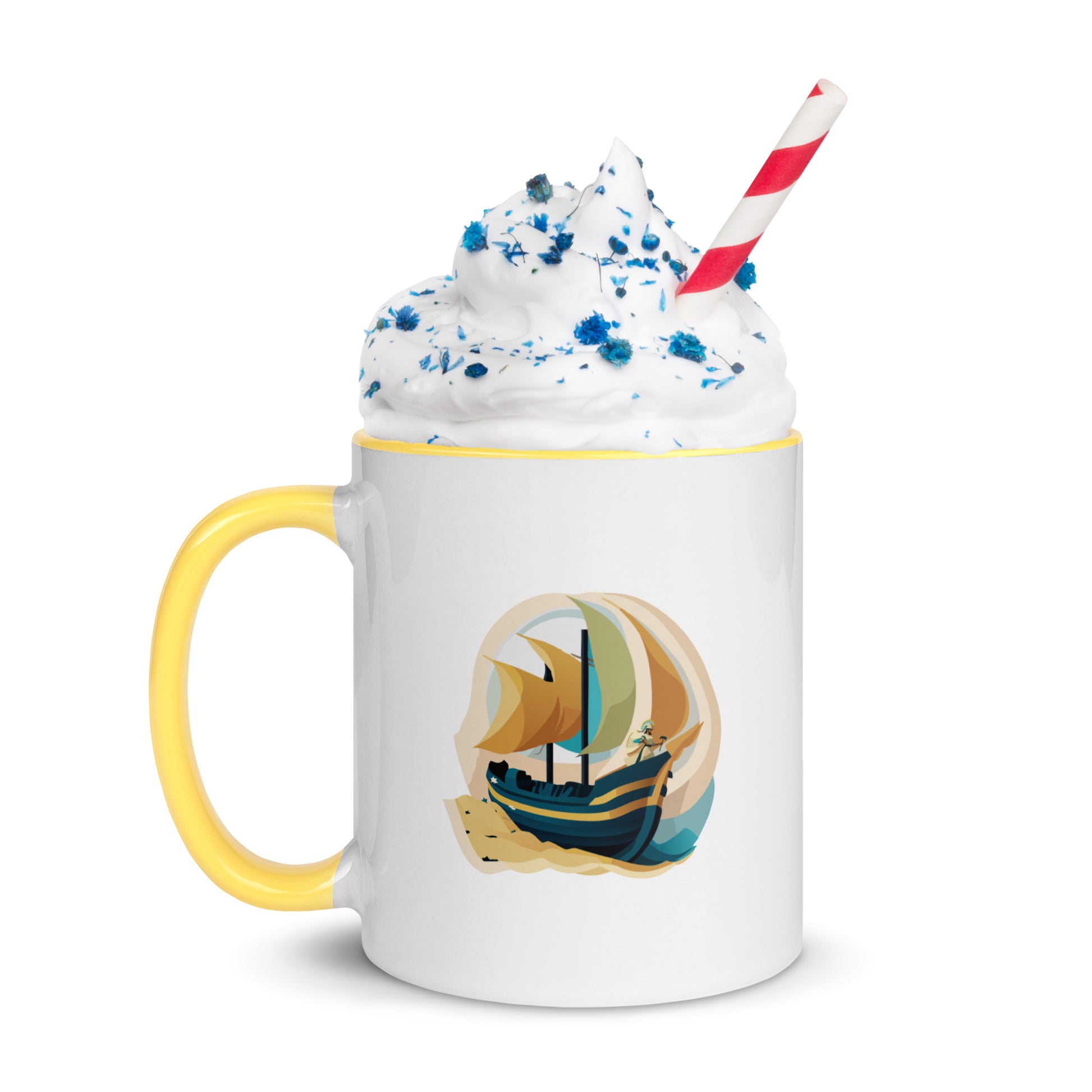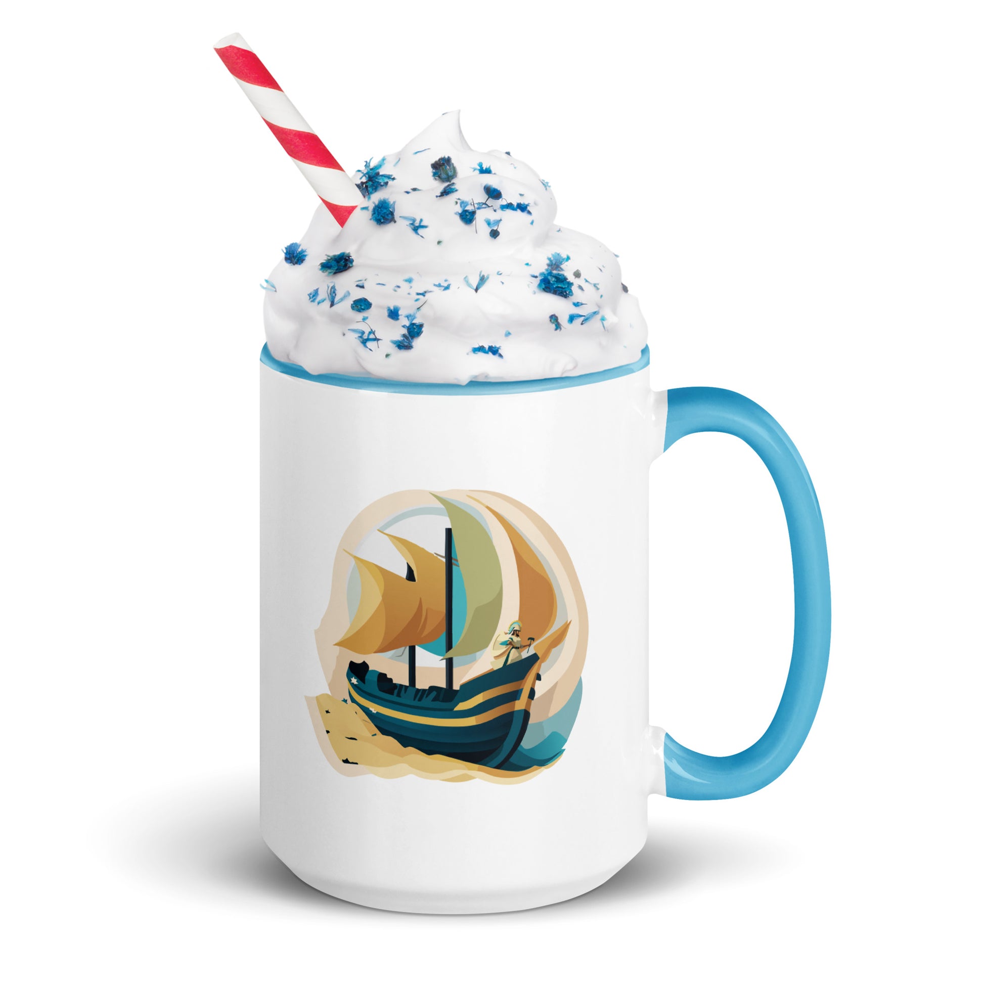 These colorful ceramic mugs show our original design, which depicts a ship losing parts to the sea, and someone at its bow armed with a hammer for repairs.