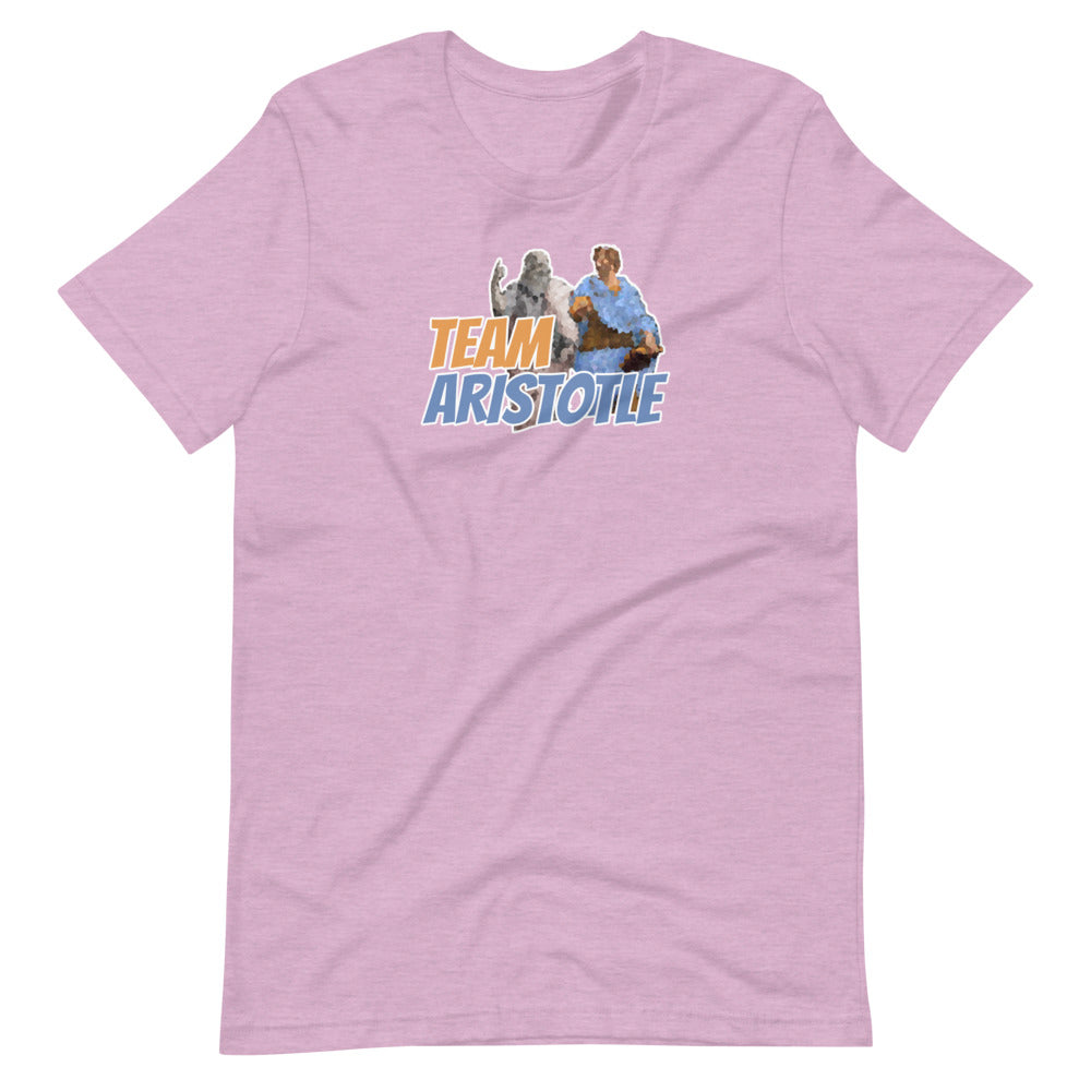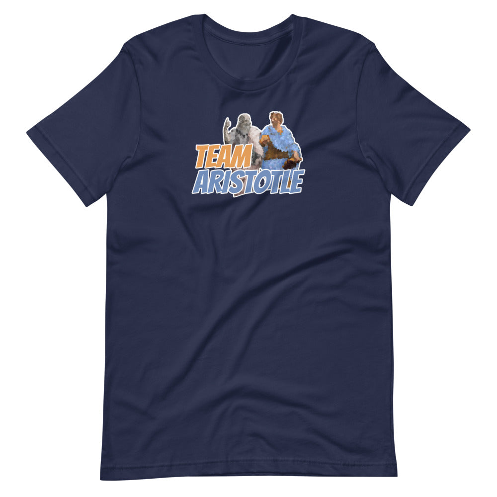 Millennia later, debates between idealism and naturalism, or variants of them, persist. This T-shirt picks the more down-to-Earth side: Team Aristotle.