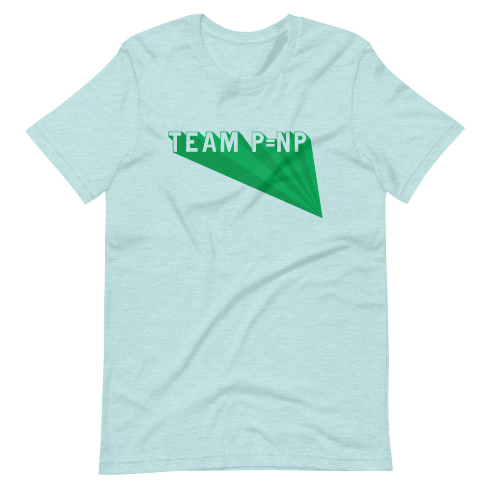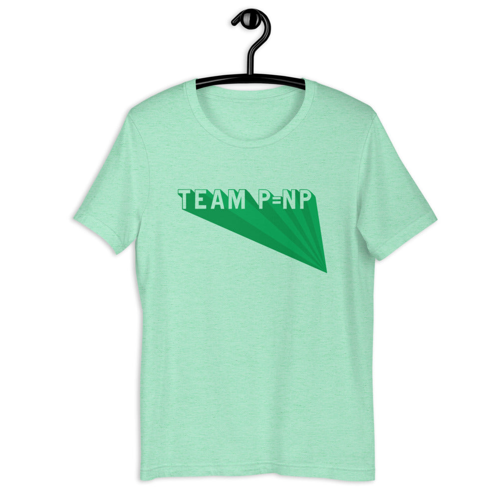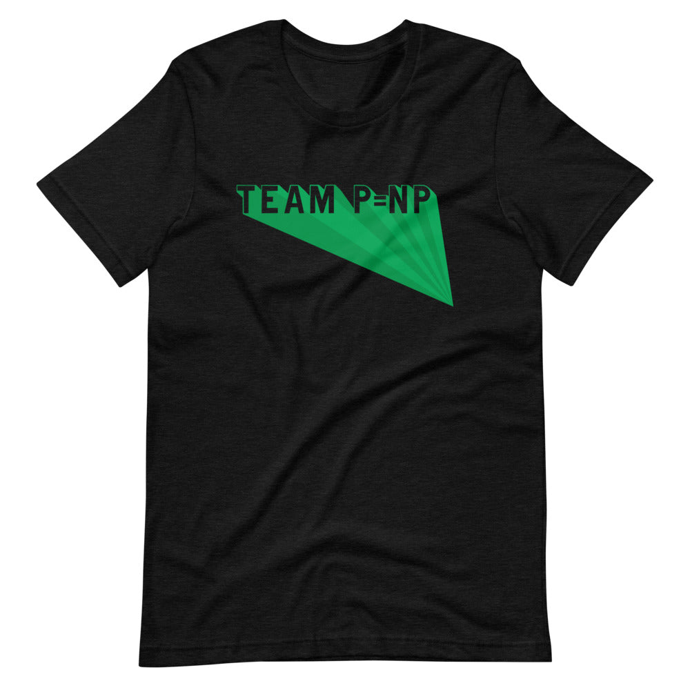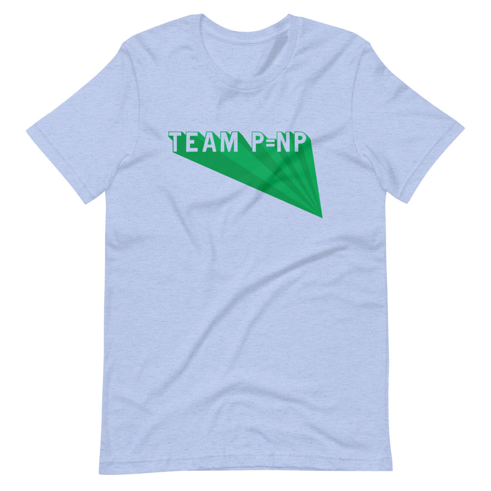 So, are you on Team P=P? Do you think that we will find an answer to this problem that will challenge existing algorithms behind cryptography and other practical concerns relying on the difficulty of solving NP problems? Is this world Impagliazzo's Algorithmica? Take a stance with this geeky shirt.