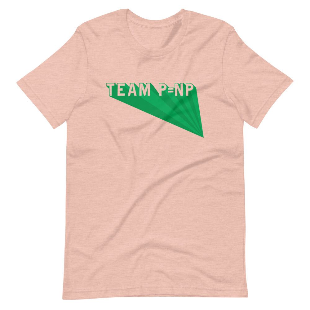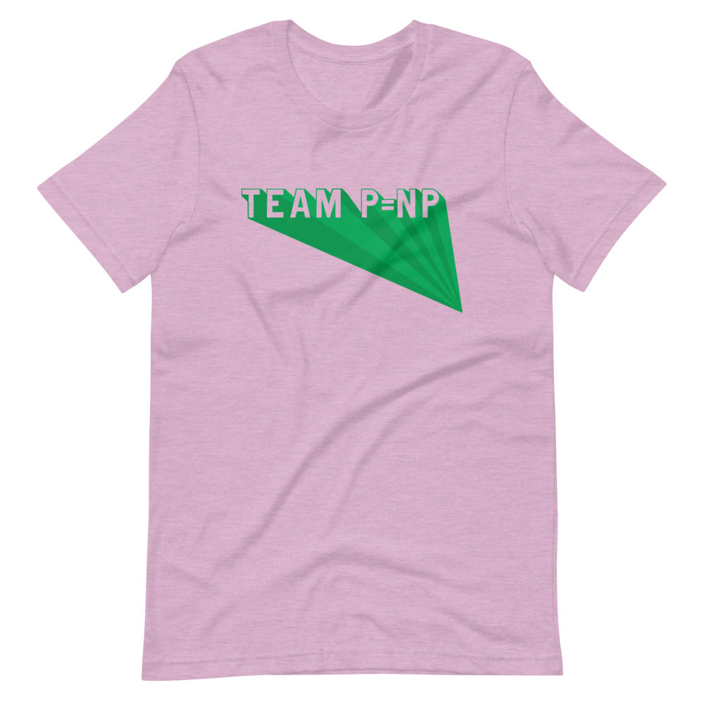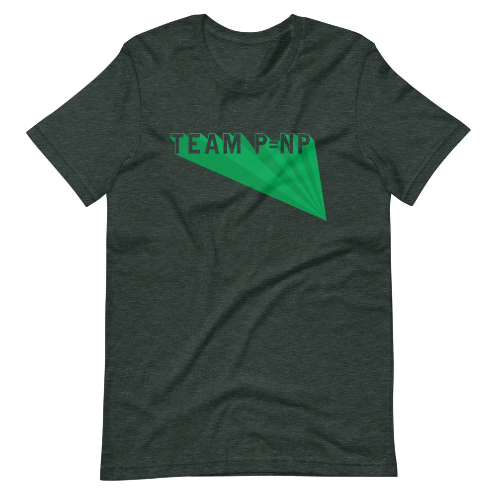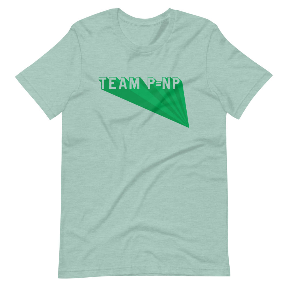 So, are you on Team P=P? Do you think that we will find an answer to this problem that will challenge existing algorithms behind cryptography and other practical concerns relying on the difficulty of solving NP problems? Is this world Impagliazzo's Algorithmica? Take a stance with this geeky shirt.